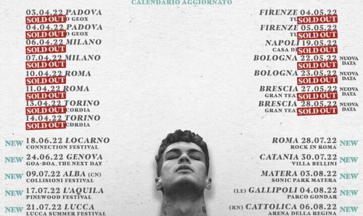 Nuove tappe e nuovi festival estivi, per un tour energico, atteso e che, di certo, porterà tutti nuovamente in musica. Un Tour, quello a cui si avrà modo di assistere, firmato Vivo Concerti con biglietti disponibili proprio da questo 8 di febbraio. Blanco, che ha ottenuto successo con singoli come, “La canzone nostra” e “Mi fai impazzire”, prenderà presto parte, il prossimo maggio, all’Eurovision Song Contest, insieme al collega Mahmood, dopo aver totalizzato la vittoria al Festival della canzone Italiana con la bellissima, “Brividi”.